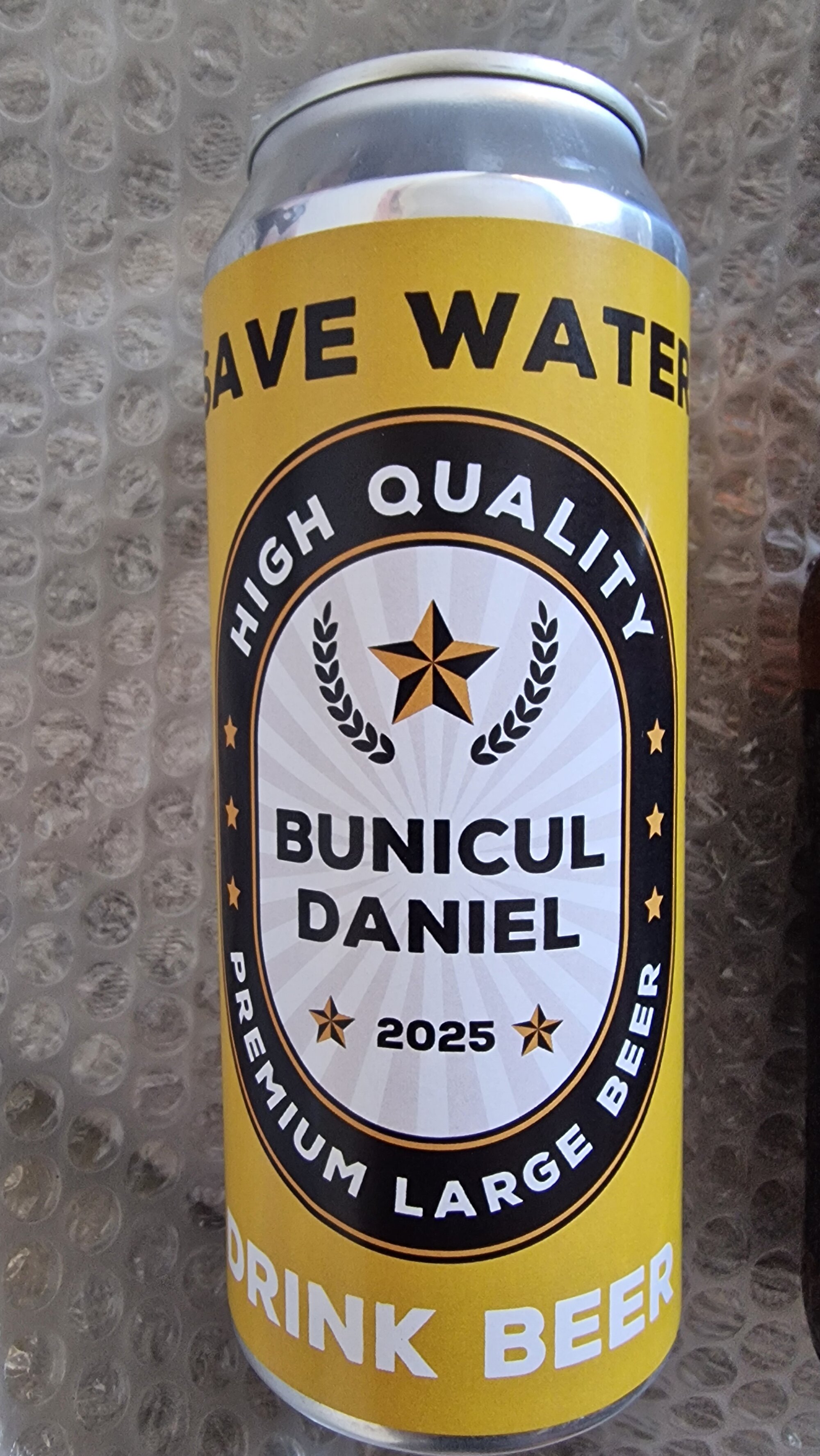 Dacă vrei să fii un pic sarcastic și să oferi un cadou mai puțin comun, te poți îndrepta către acest model de bere, cu un îndemn aparte. Mai mult de atât, o poți personaliza cu numele destinatarului, anul și ziua când îi oferi cadoul sau orice alt text care dorești să fie scris pe doză.