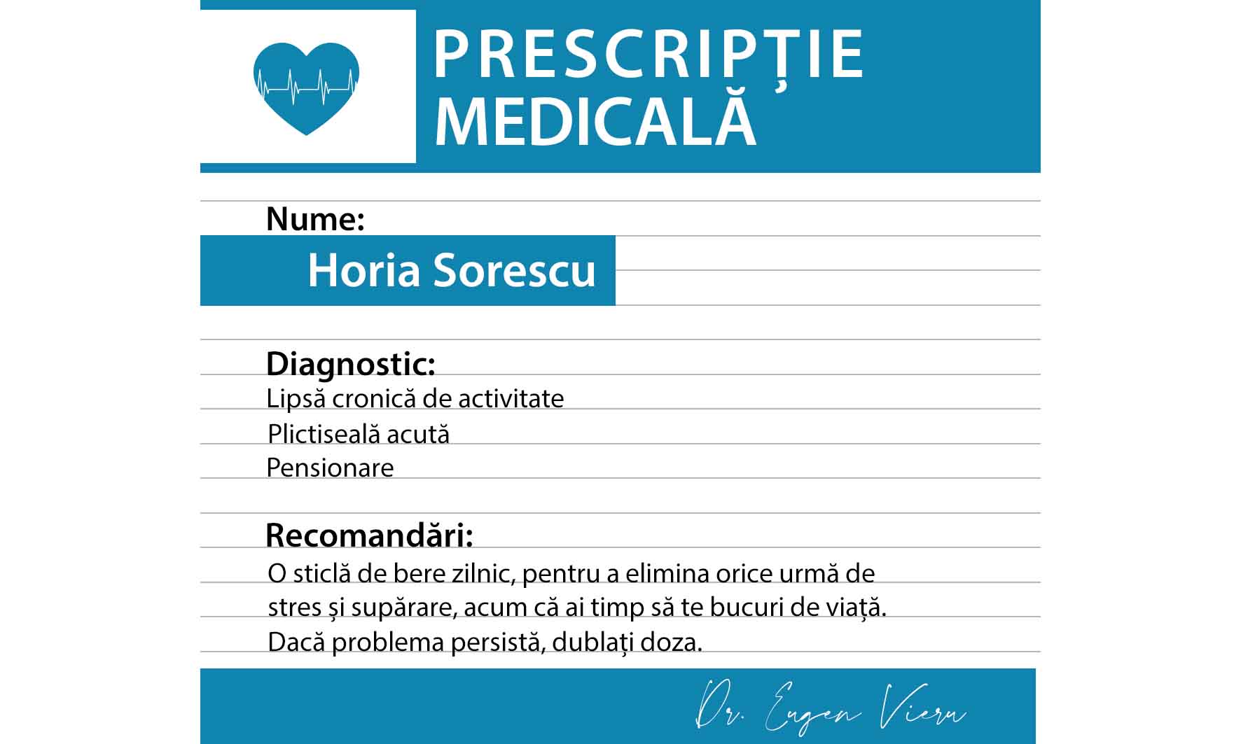 Așa că pentru o pensionare înfloritoare noi recomandăm o prescripție medicală. Mai multă mișcare, plimbări în aer liber, vacanțe și multă, multă voie bună. Aaa și recomandăm și berea marca StarGift, pentru orice urmă de stres sau supărare iar dacă aceste stări persistă să se dubleze doza. Dar...există și un dar :p. Să fie totul cu măsură și cu responsabilitate!