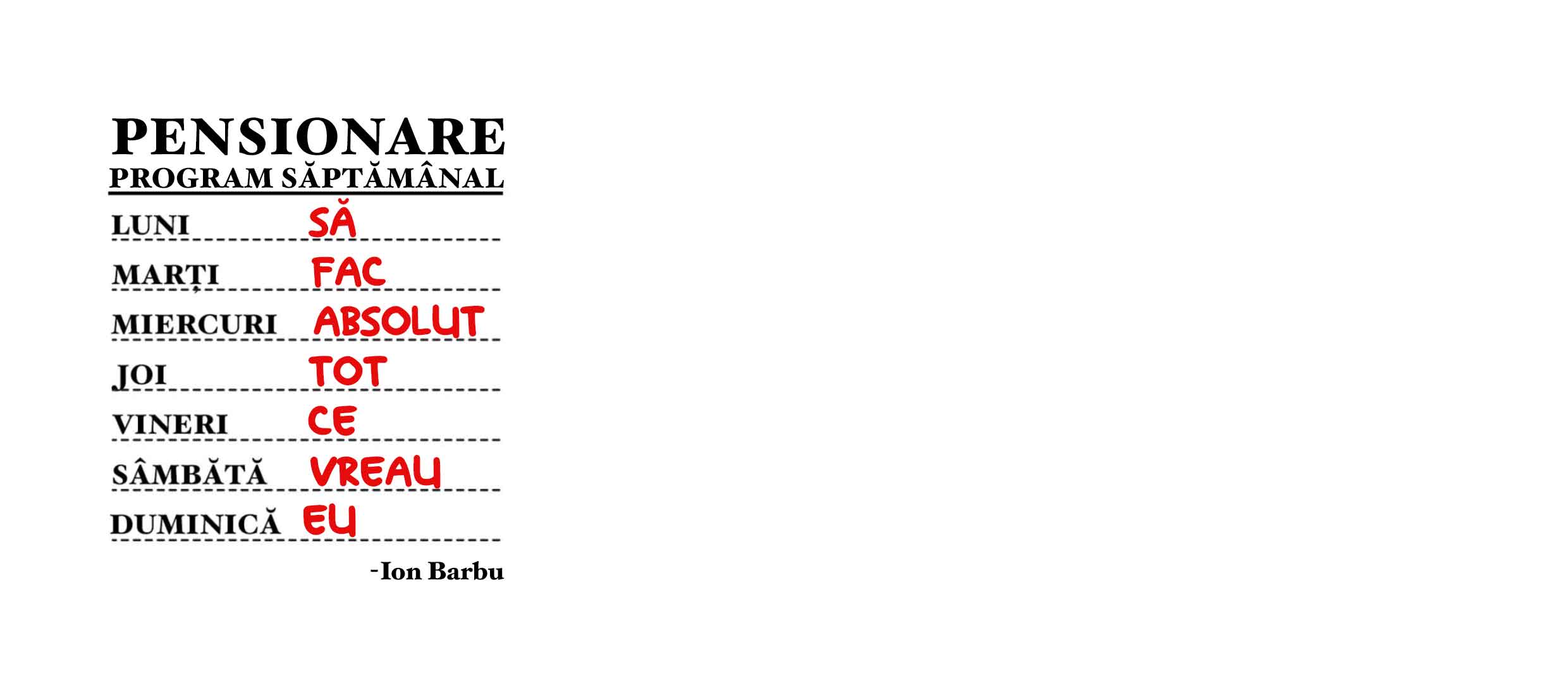 După o viață plină de muncă, în sfârșit a venit momentul mult așteptat - pensionarea! Este timpul să uiți de ședințele plictisitoare de la muncă, de zilele când te trezeai cu alarmă, de stresul zilnic și listele interminabile cu lucruri pe care trebuia să le termini. Spune-le "pa" grijilor și "bună!" momentelor de relaxare totală și zilelor pline de libertate și, dacă tot vrei să te relaxezi la maxim, credem că acest model de cană este perfect pentru tine. Care este planul tău săptămânal?