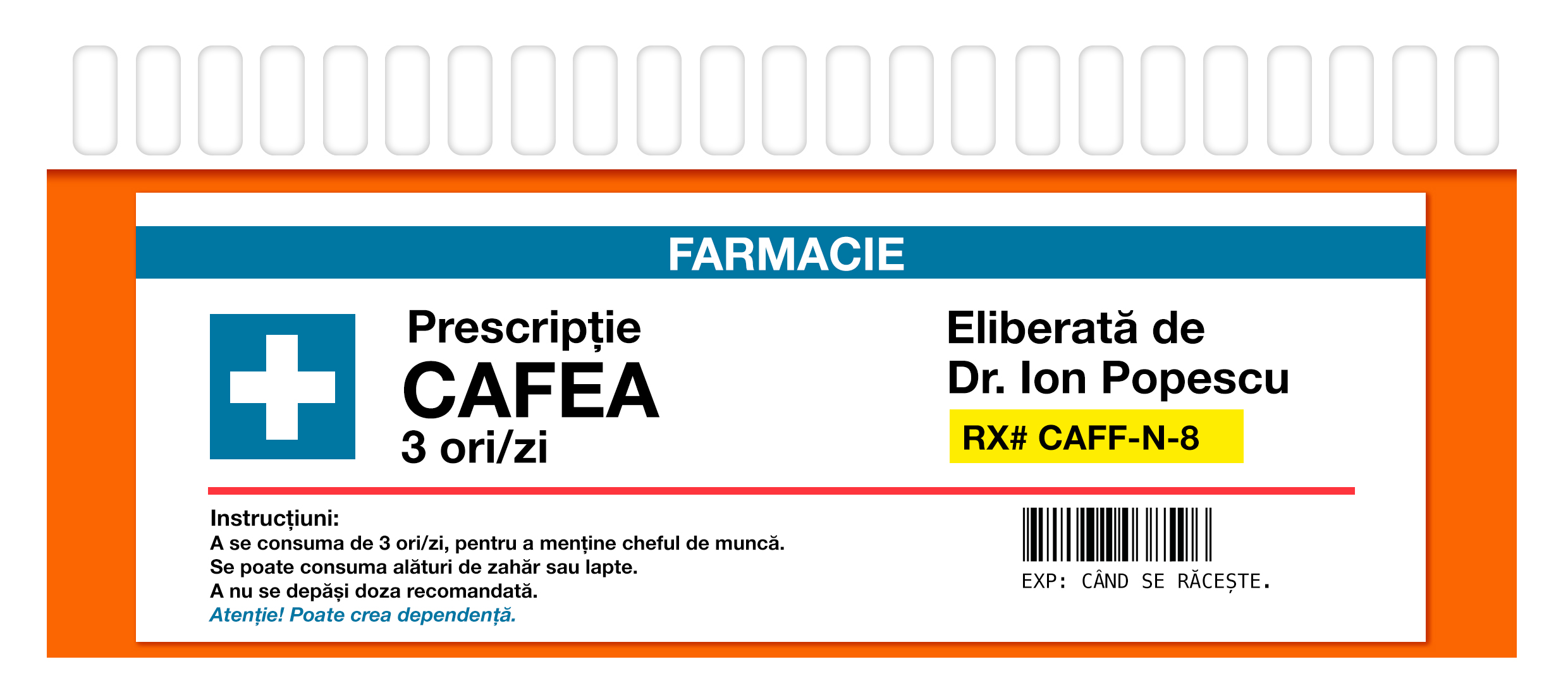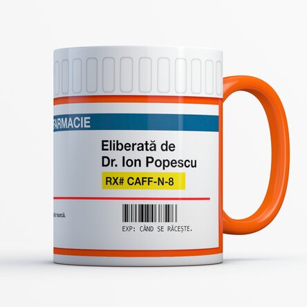 Pentru o zi energică și cu multe task-uri recomandăm o cană personalizată cu prescripție medicală dedicată fix pentru iubitorii de cafea. Dacă cunoști aceea persoană inebunită după savoarea ei, iți recomandăm să îi oferi o astfel de cană cu îndrumările aferente personalității ei/lui și recomandările medicale de rigoare.