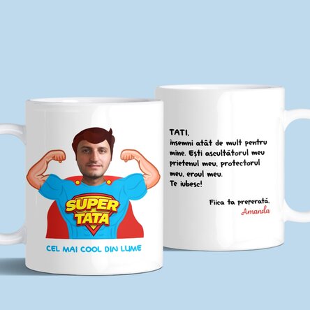 În dorința de a demonstra că ei sunt capul familiei, că pot să susțină și să fie un ajutor de nădejde în orice situație, de multe ori în ochii copiilor și a familiei este privit ca un super tată. Pentru un super men din viața noastră poți să oferi o cană personalizată perfectă pentru super eroul din viața ta.
