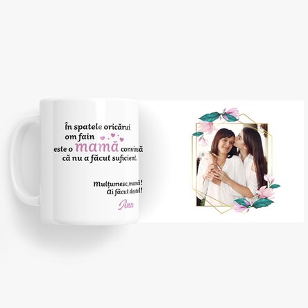 Spune-i mamei tale cât de mult o apreciezi și cât de mult îi mulțumești pentru tot ce a făcut pentru tine, prin această cană personalizată cu o fotografie și numele tău.