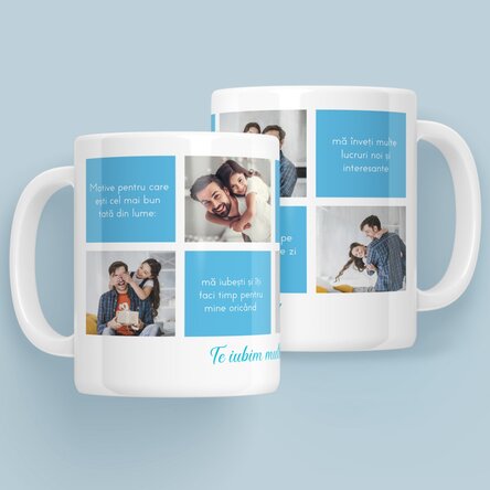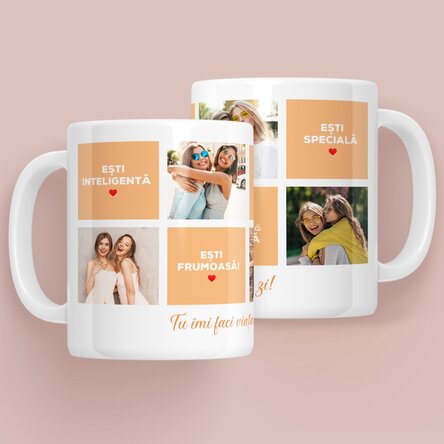 Dacă vrei să îți surprinzi iubita de Valentine's day, sau mama de 8 martie, nu trebuie decât să faci niște pași extrem de simpli. Găsește cele mai dragi fotografii ale voastre și transmite-le ceea ce simți, care sunt principalele motive pentru care îi apreciezi cu această cană personalizată. Le vei aduce un zâmbet pe buze în fiecare moment al zilei și se vor bucura de fiecare cană de cafea sau ceai. E simplu să îi faci fericiți pe cei din jurul tău.