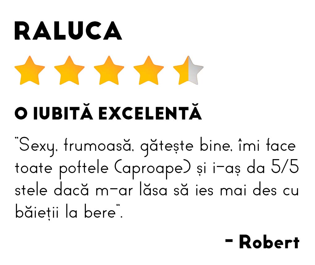 Dacă ar fi să scrii o recenzie despre un prieten, ce ai avea de spus? Care sunt motivele pentru care i-ai da doar 4,5/5 stele? :) Unde ar mai fi farmecul dacă ar avea 5/5?