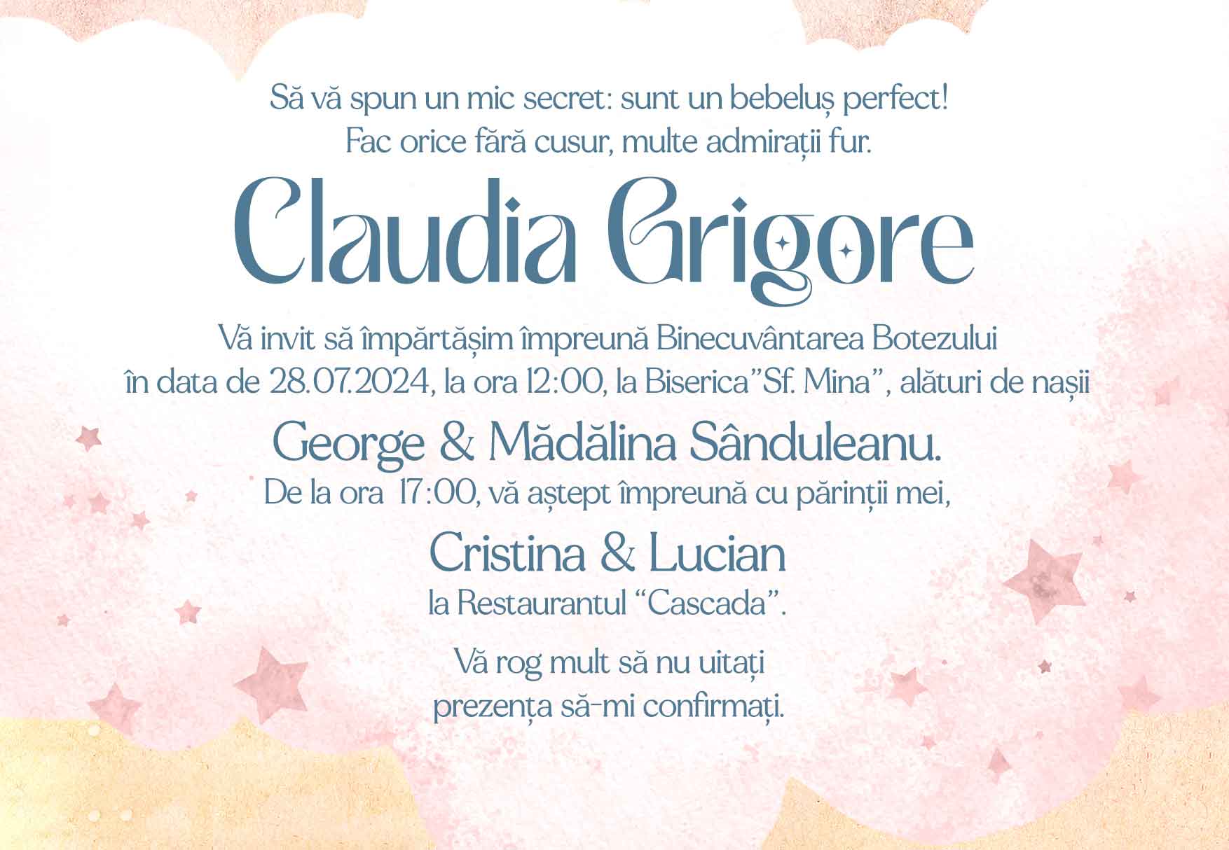Card personalizat cu text - Invitatie pentru botez - Unicorn Univers