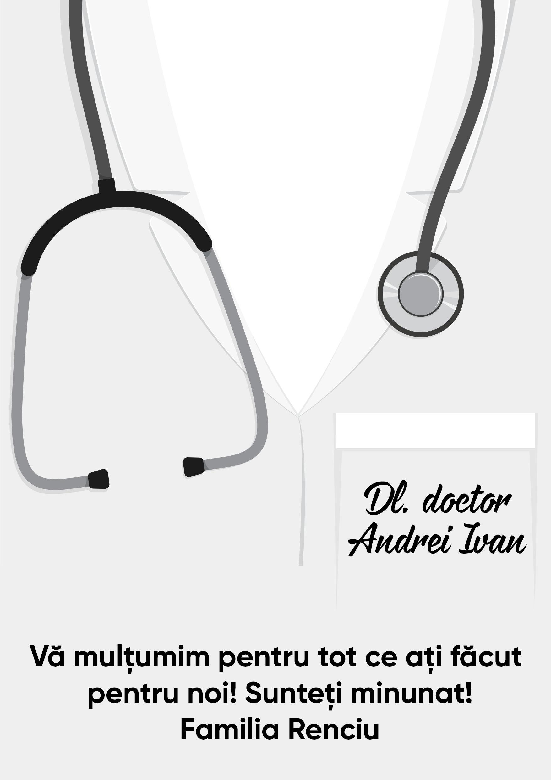 Un gest mic cu un impact mare! Acest card personalizat este dedicat eroilor în halate albe – doctorii care ne oferă zilnic grijă, încredere și speranță. Alege un mesaj de apreciere sincer și emoționant pentru a-ți exprima recunoștința față de medicul tău preferat.