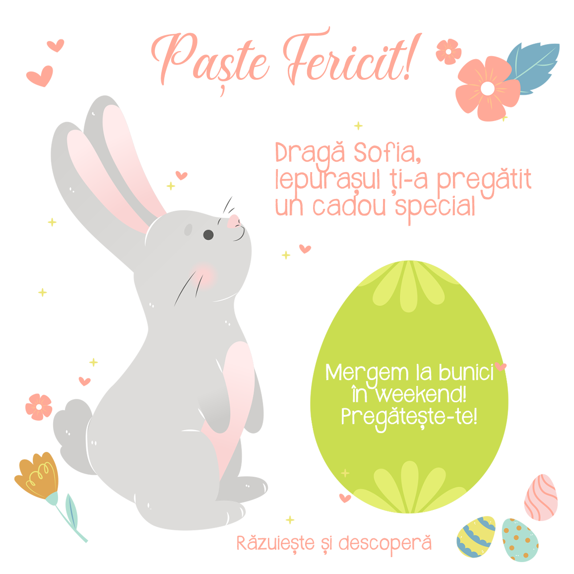 Cu ocazia sărbătorilor Pascale, poți oferi celor dragi un cadou simpatic, dar inedit. Acum poți să ascunzi mesajele dorite sub forma unui card răzuibil și să îi lași să descopere ce se află dedesubt, într-un mod distractiv. Cu siguranță reacțiile vor fi pe măsură și garantăm multe zâmbete pe buze! Ce pot personaliza? Cardul poate fi personalizat cu text.