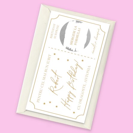Surprinde pe cineva drag cu o experiență memorabilă, ascunsă sub stratul magic al unui card răzuibil.Acest card tip boarding pass este modalitatea perfectă de a anunța o vacanță-surpriză, o escapadă romantică sau o aventură de neuitat. Personalizează textul cu numele destinatarului, un mesaj special și detalii amuzante despre „zborul” vostru, iar sub zona răzuibilă se va ascunde destinația secretă.