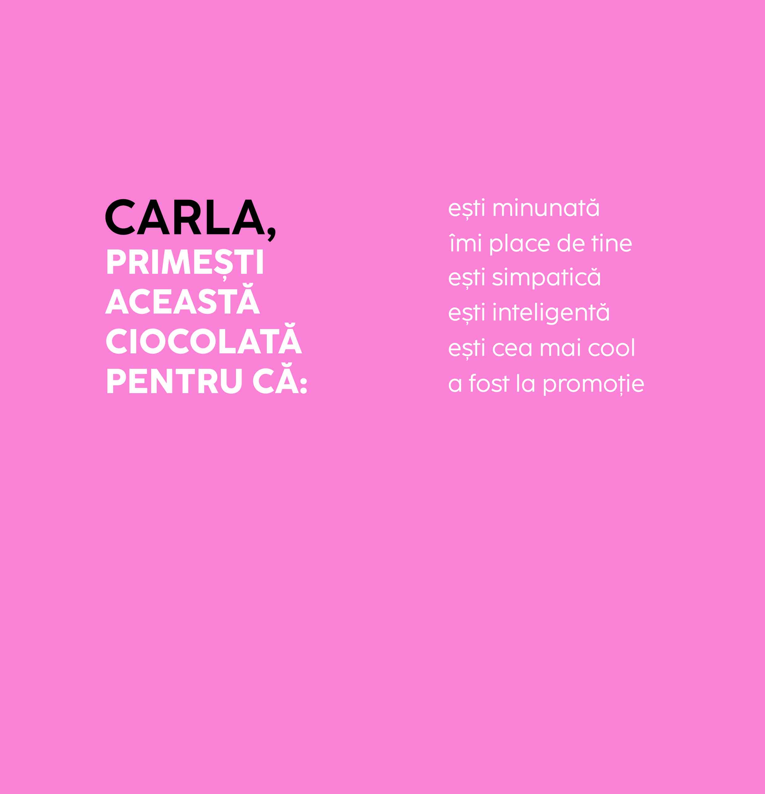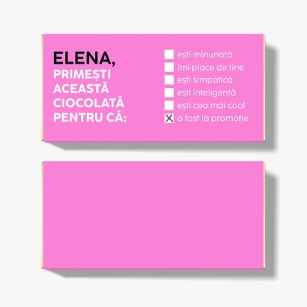 A primit această ciocolată pentru că... e imposibil să nu-i faci ziua mai dulce! Personalizată cu multe motive amuzante, acest cadou adaugă un strop de veselie și multă savoare ocaziei speciale. Poate că nu poate rezolva toate problemele, dar cu siguranță face totul mai dulce... și mai amuzant! Ce pot personaliza? Ciocolata poate fi personalizată cu mesaj