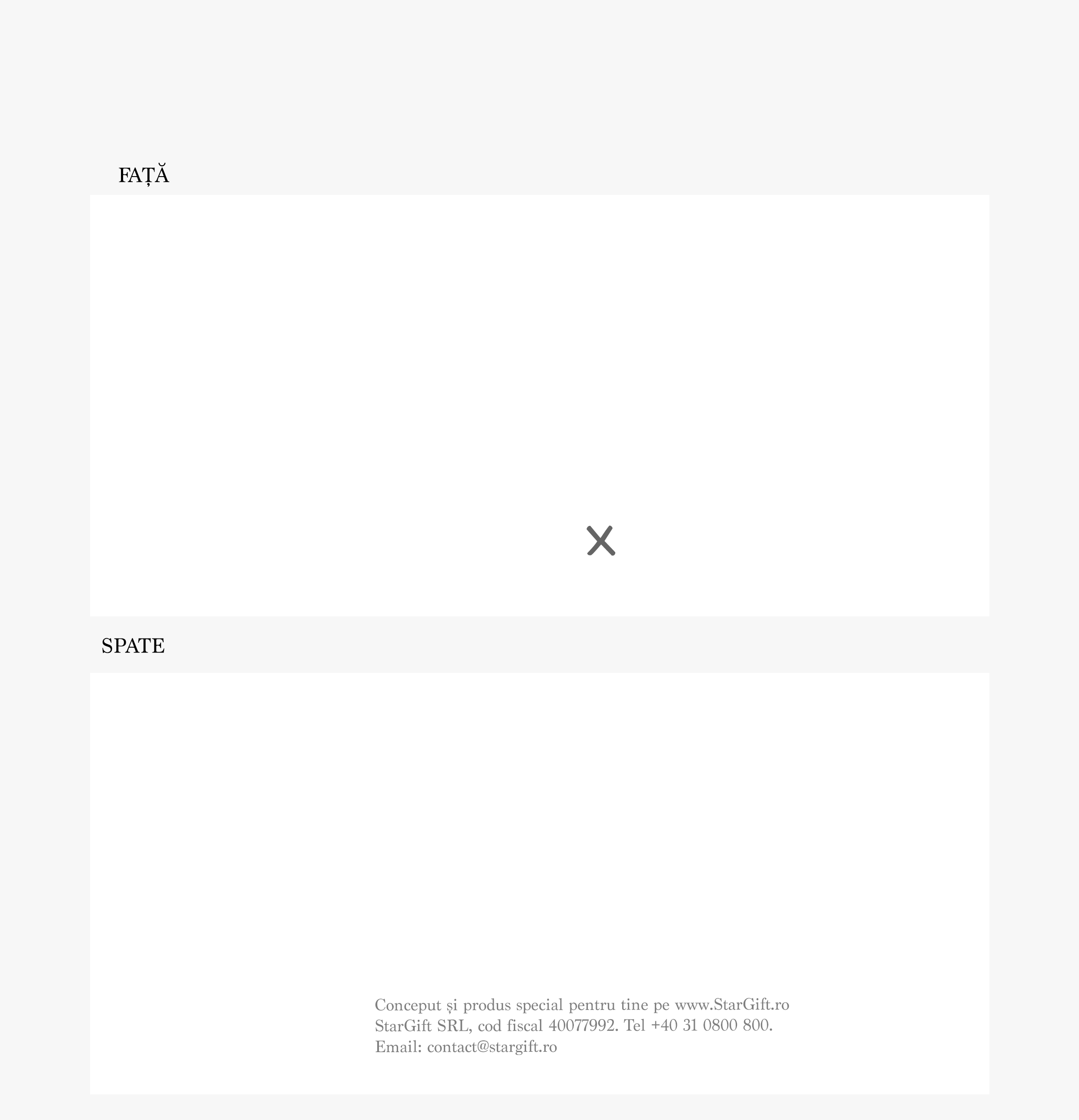 Cum pot face personalizarea? Pasul 1: Apasă pe butonul "Personalizare" Pasul 2: Completează rândurile de text cu mesajul dorit, alege culoarea de fundal și apasă pe butonul "Confirmă Pasul 3: Cum ai terminat personalizările, apasă butonul "Finalizare" și adaugă produsul în coș.