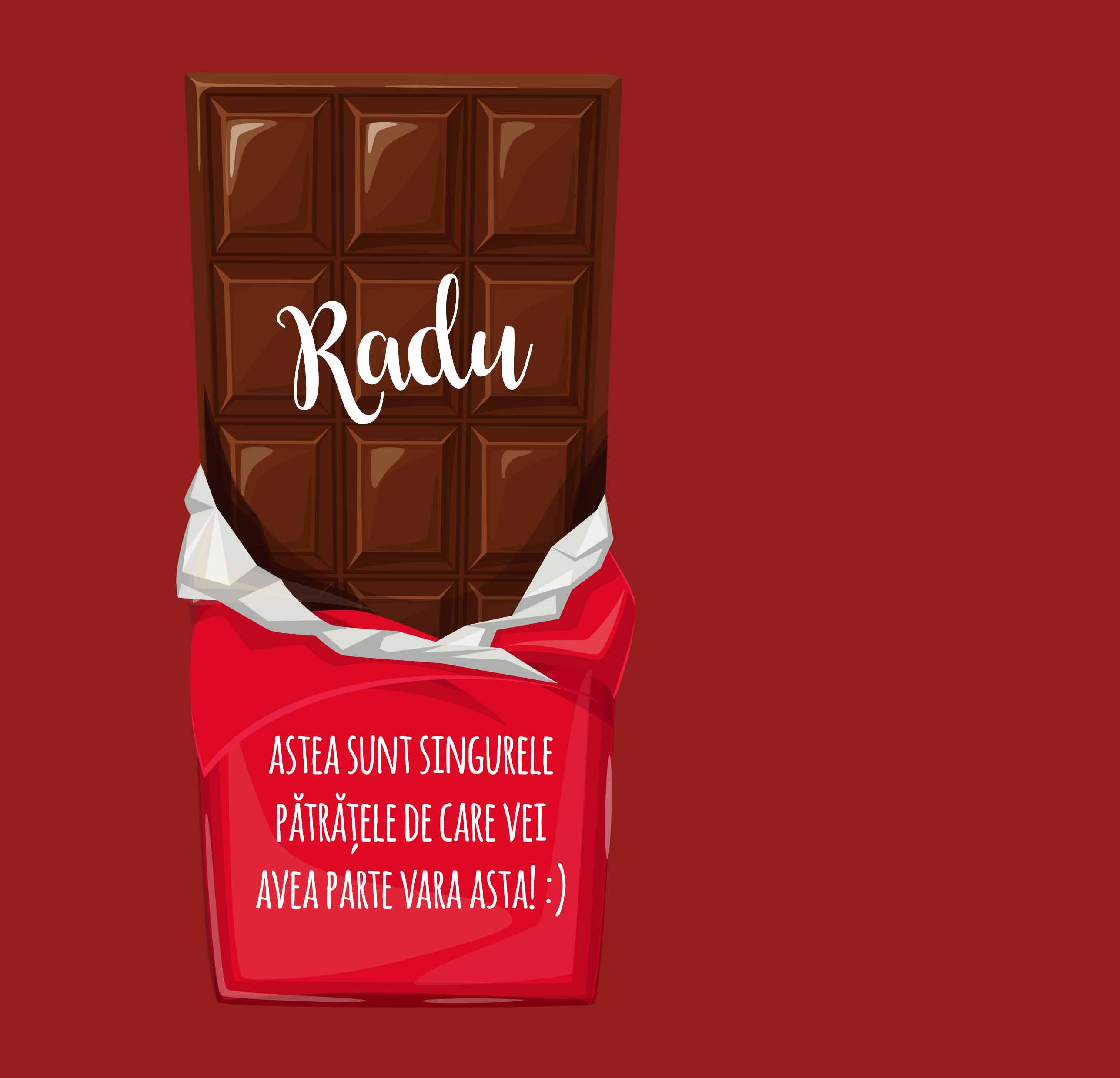 Să fie ciocolata unul din dulciurile foarte greu de refuzat indiferent dacă ții tare la dieta ta? Noi credem că un pătrățel de ciocolată poate să facă excepția! Dacă vrei să ai pătrățele vara asta noi ți le putem oferi fără prea multe eforturi într-o ciocolată personalizată cu numele ei/lui și un mesaj original.