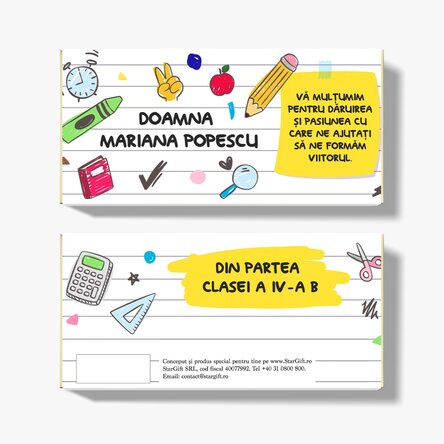Vezi și alte Back to school, Cadouri de 1 martie, Cadouri de 8 Martie, Cadouri de primăvară, Cadouri de Ziua Mamei si de 8 Martie, Dulciuri pentru 8 martie, Dulciuri personalizate pentru absolvire, Toate cadourile de 8 Martie, Toate cadourile de sfârșit de an, Cadouri pentru profesoară, Cadouri pentru profesor, Cadouri personalizate de absolvire pentru profesori, Cadouri personalizate pentru profesoare de 8 martie, Dulciuri pentru profesori, Cadouri personalizate, Ciocolată personalizată, Toate dulciurile și bomboanele personalizate, Recomandările noastre, Cadouri pentru iubitorii de ciocolată, Adulți, Dulciuri Back to school, Cadouri personalizate la reducere, Dulciuri și bomboane personalizate, Cadouri de apreciere, Dulciuri personalizate de apreciere, Dulciuri personalizate la reducere, PROFESORI, Toate cadourile back to school, Toate cadourile de început de an școlar.