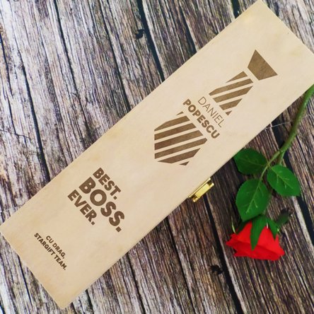 Este un dar deosebit, cu o notă unică, dată de mesajul gravat în lemn, pe care orice șef îl va păstra cu mândrie, găsindu-i un loc de cinste, undeva la vedere, în biroul său.Și ca să vă asigurați că veți avea cadoul perfect, completați cutia și cu o sticlă de vin din sortimentele alese oferite de StarGift.