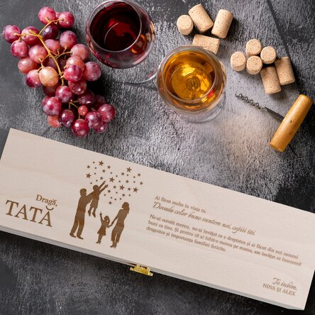 Surprinde-l cu o cutie de vin personalizată special pentru el! Transmite-i dragostea ta prin acest cadou și, cu siguranță, gestul tău îl va face fericit! Este un cadou elegant, care se distinge, totodată, prin simplitate. Iar acea notă deosebită, oferită de gravura făcută în lemn, îi conferă un plus de unicitate pe care orice o va aprecia! Și ca să ai cadoul complet, alege de la StarGift și o sticlă de vin alb, roșu sau rose.