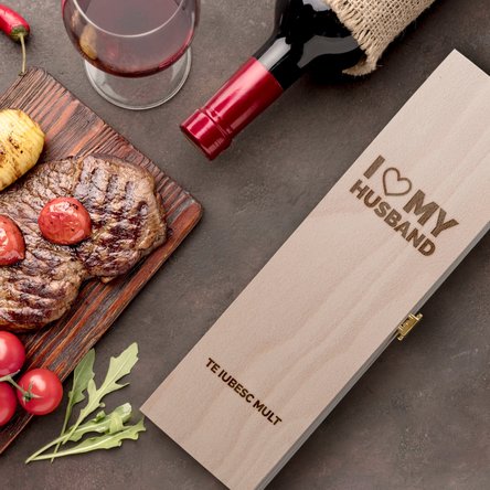 Surprinde-ți soțul cu o cutie de vin personalizată special pentru el! Transmite-i dragostea ta prin acest cadou și, cu siguranță, gestul tău îl va face fericit! Este un cadou elegant, care se distinge, totodată, prin simplitate. Iar acea notă deosebită, oferită de gravura făcută în lemn, îi conferă un plus de unicitate pe care orice soț o va aprecia!Și ca să ai cadoul complet, alege de la StarGift și o sticlă de vin alb, roșu sau rose.