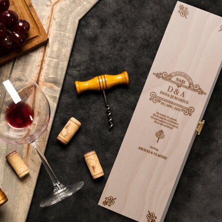 Ți se pare o alegere mult prea banală? Dar dacă oferi sticla de vin într-o cutie personalizată? Un mesaj special, inscripționat cu un font elegant, poate face diferența. Cu un design simplu, dar de efect, cutia de vin se va încadra perfect în orice decor. Pe orice raft va fi pusă, va atrage cu siguranță atenția și îi va aminti destinatarului de tine.