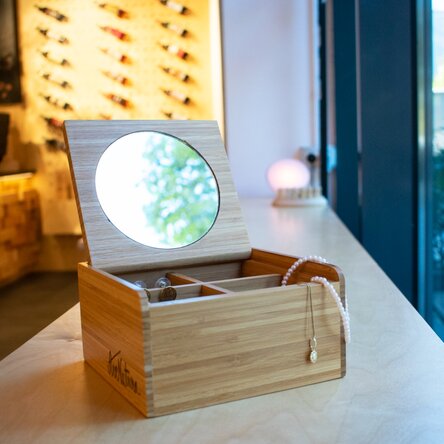 De-alungul timpului ne creăm o colecție minunată de bijuterii, care toate merită un loc special. Cutia de bijuterii este creată special pentru acest lucru, având spațîi de păstrare cu 3 organizatoare și o oglindă concepută pe post de capac. Cutia este locul perfect pentru toate accesoriile și bijuteriile dvs. Material: Lemn din bambus și sticlă