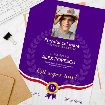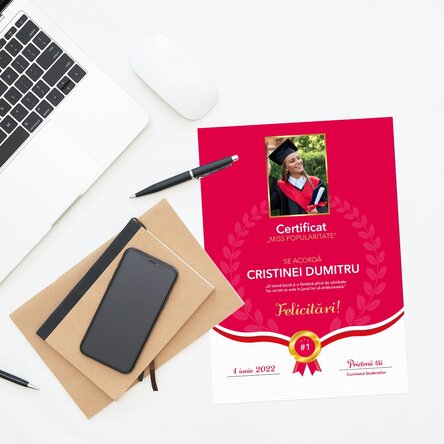 Unele din cele mai importante evenimente din viață unui tânăr este absolvirea liceului sau a facultății. Dacă ești în căutarea unei diplome pentru festivitatea de premiere sau absolvire, ai ajuns unde trebuie! Ai posibilitatea să încarci o fotografie, să completezi toate detaliile generale și mai mult de atât să scrii un mesaj personalizat. Urează-i cele mai frumoase gânduri pentru viitor sau completează cu unul din motto-urile lui/ei.