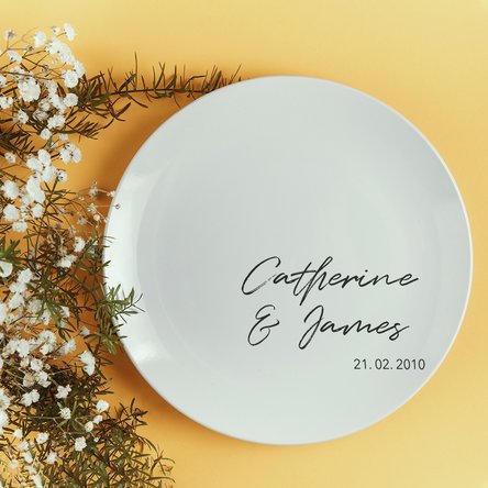 Dacă vrei să oferi un plus decorativ mesei, poți opta pentru o farfurie personalizată cu text, perfectă pentru a inaugura momentul special din viața ta!