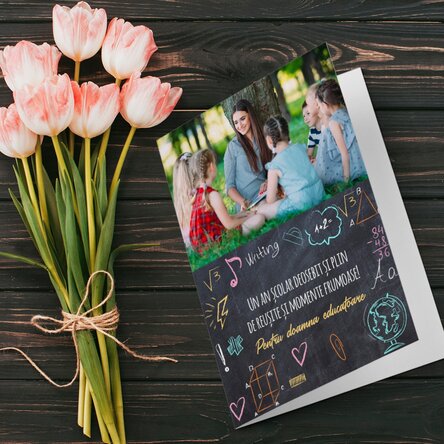 Pentru că aveți posibilitatea personalizării acesteia și este și dedicată chiar lor, alegeți mesajul potrivit, iar de restul ne ocupăm noi. De asemenea la fiecare sfârșit de an sau început, pe lângă cadoul pe care îl oferiți profesorului din partea clasei, aveți posibilitatea de a personaliza această felicitare cu un mesaj din partea tututor colegilor și o fotografie cu toată clasa.