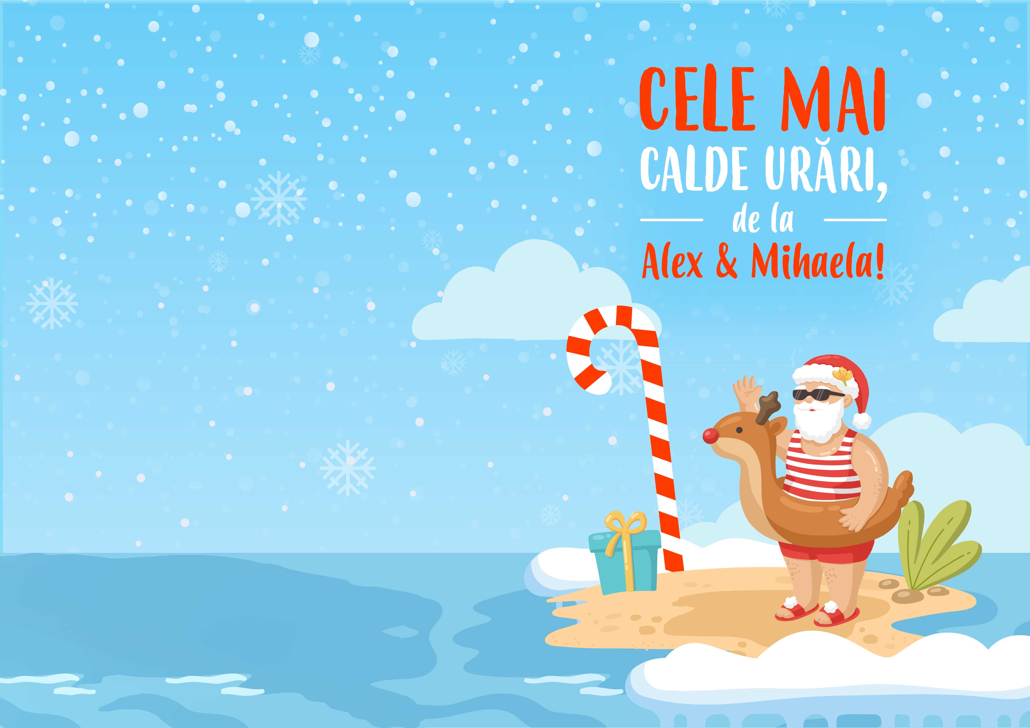 Răspândește veselia sărbătorilor cu o notă de căldură tropicală! Felicitarea noastră de Crăciun "Urări Călduroase" oferă o perspectivă amuzantă asupra sezonului rece, prezentându-l pe Moș Crăciun așa cum nu l-ai mai văzut până acum — în costum de baie, cu ochelari de soare și un colac de înot în formă de ren!