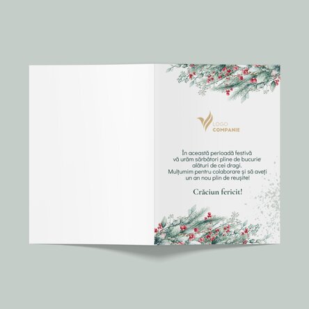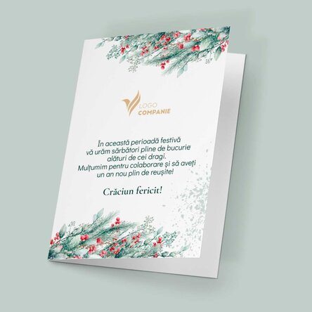 Iar dacă vrei să îți motivezi angajații și să se simtă că au o contribuție importantă în compania ta, indiferent de poziția pe care o ocupă, ori dacă vrei să oferi o atenție deosebită colaboratorilor tăi, noi îți recomandăm acestă felicitare personalizată cu motive de Crăciun și cu logo-ul companiei tale pentru a le transmite cele mai calde și frumoase urări de sărbători.