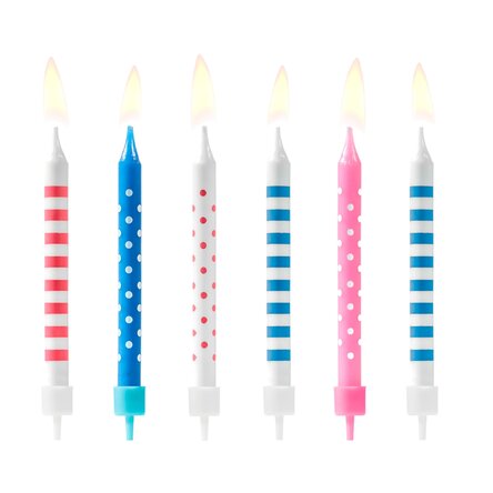 Set cu 6 lumânări de tort cu imprimeu dungi și buline, amestec de 3 culori pastelate. Dimensiune: 6.5 cm (înălțime)