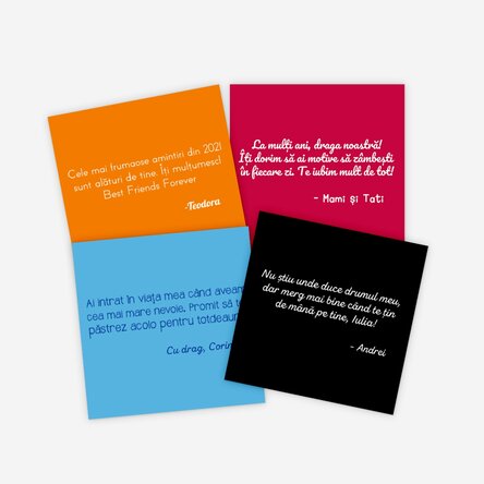 Vrei să îi transmiți cuiva drag un mesaj care să îi aducă zâmbetul pe buze în fiecare zi? Magnetul personalizat este produsul de care ai nevoie. Poți alege chiar și culoarea fundalului pentru ca acesta să fie cu totul special! Ce pot personaliza? Magnetul poate fi personalizat cu mesaj. Cum pot face personalizarea? Pasul 1: Apasă pe butonul "Personalizare" Pasul 2: Completează câmpurile de text cu mesajul dorit, alege culoarea textului și a fundalului, apoi apasă butonul "Confirmă" Pasul 3: Cum ai terminat personalizarea, apasă butonul "Finalizare" și adaugă produsul în coș.