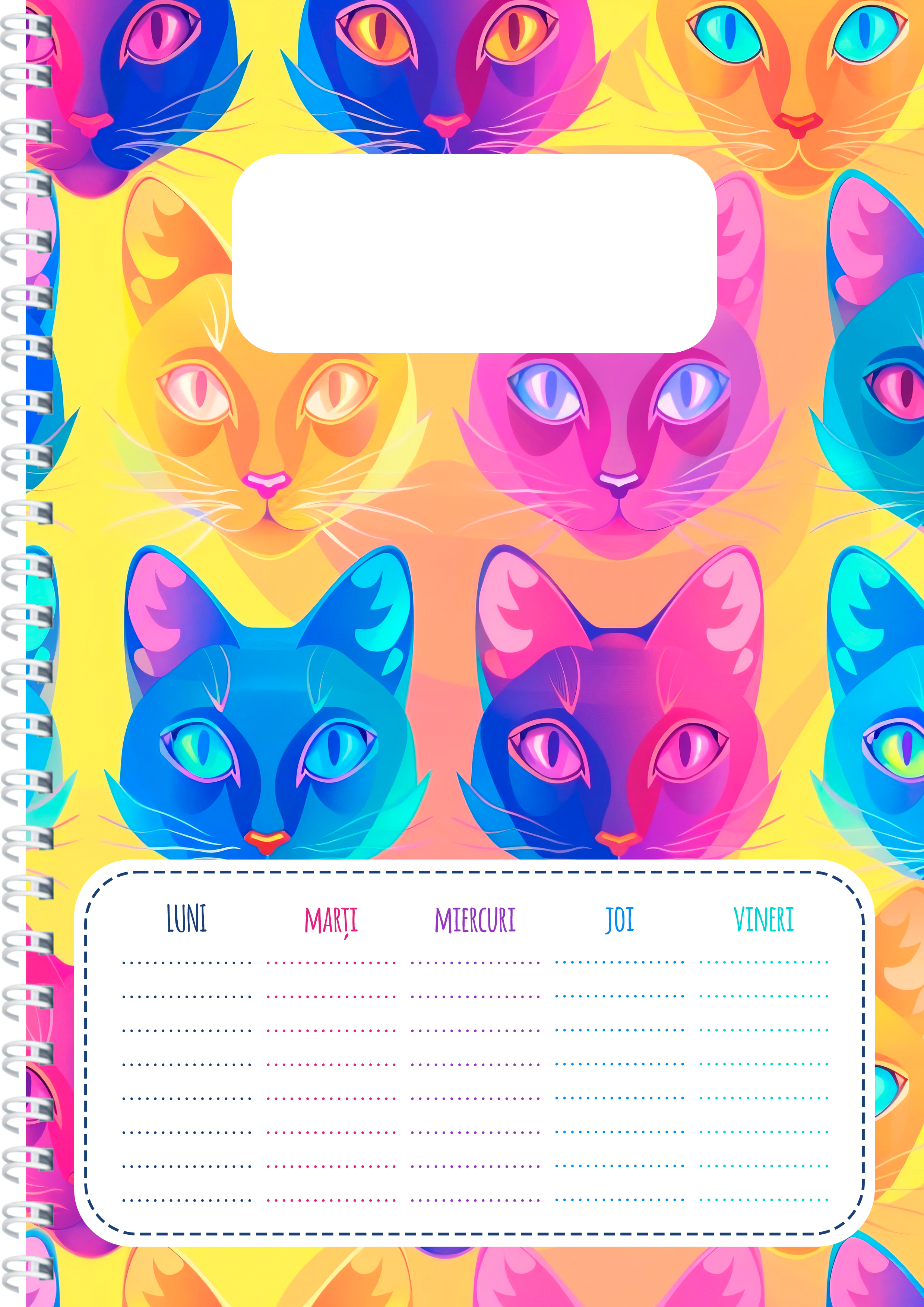 Pentru pasionații de feline am creat notebook-ul purrr-fect, super colorat și super vesel, pentru a-ți exprima iubirea pentru pisicuțe și stilul tău unic și vibrant. Pe lângă modelul său jucăuș, notebook-ul nostru mai conține un orar ce oferă destul spațiu pentru notarea tuturor orelor din programul tău și un spațiu dedicat completării cu numele și prenumele tău, materia și clasa din care faci parte.