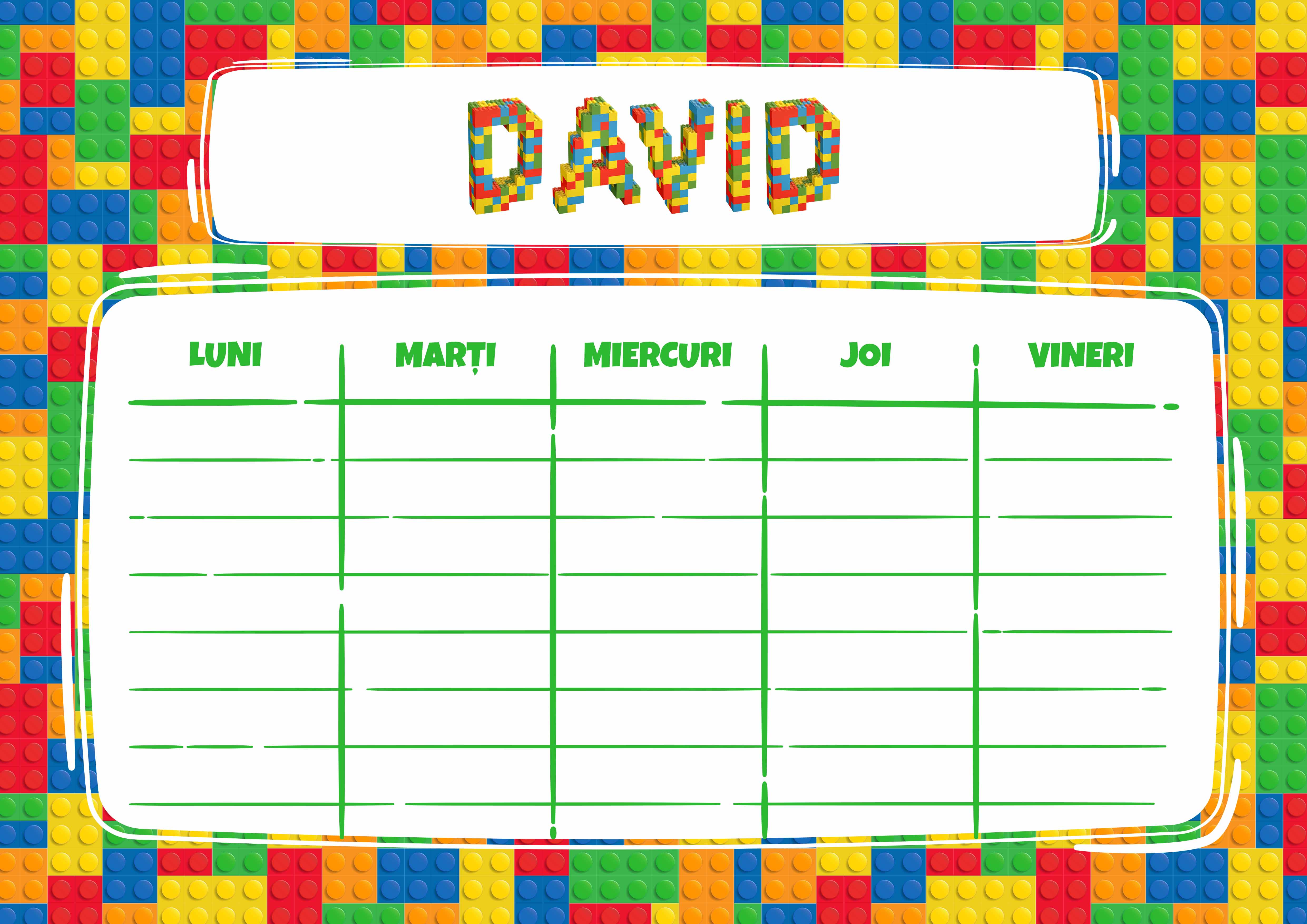 Îi poți face o surpriza copilului tău cu un orar personalizat cu numele lor și sigur vor fi încântați să îl realizeze într-un mod curat sau colorat, numai bun de pus la loc de cinste pentru a le aminti care sunt orele și activitățile pe care le au în program.