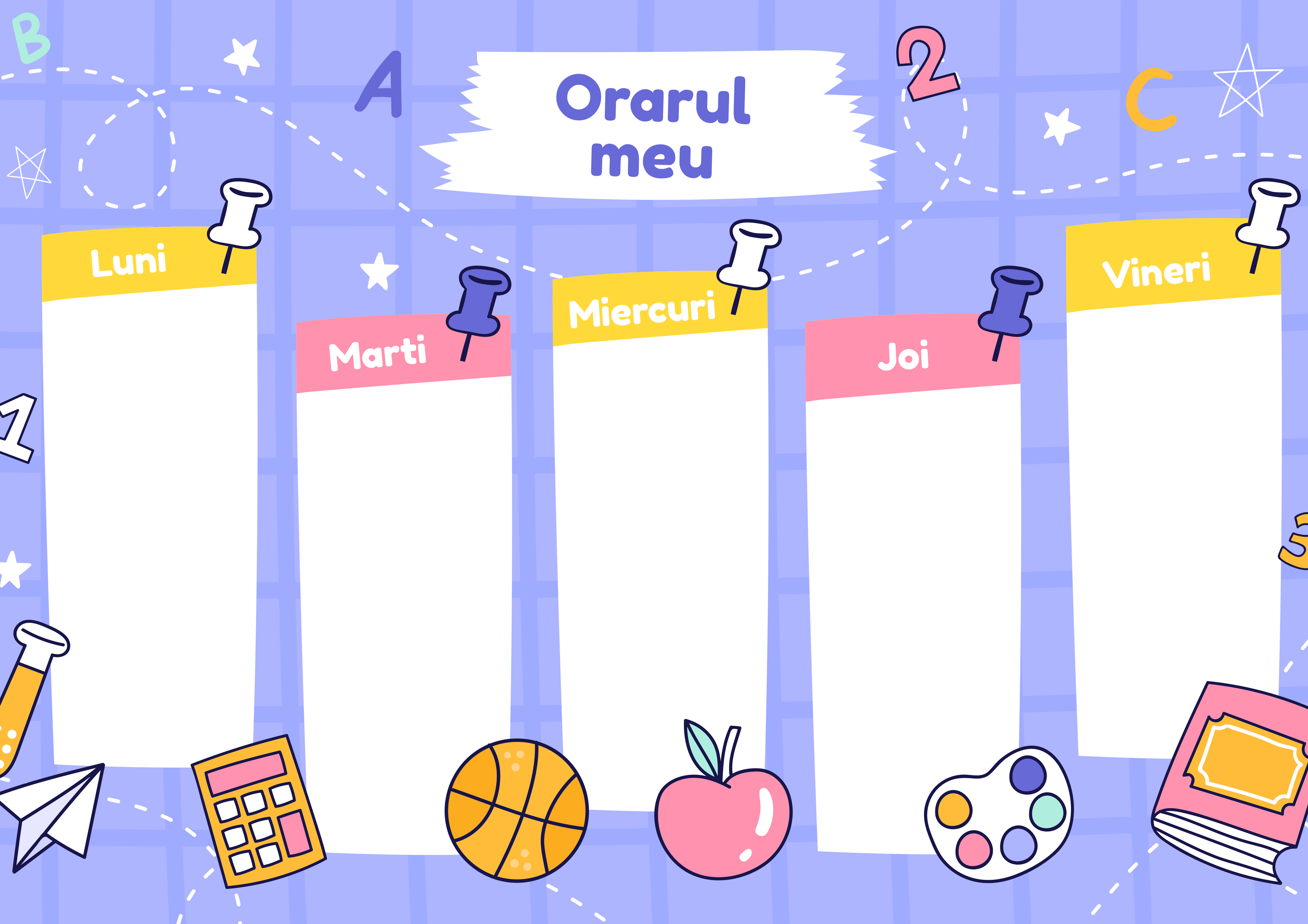 Cel mai bun mod de a ține evidența pentru toate orele celor mici este un orar bine stabilit și structurat cât mai simplu. De ce să pierzi ore până să realizezi un orar când poți personaliza foarte ușor unul pentru copilul tău?