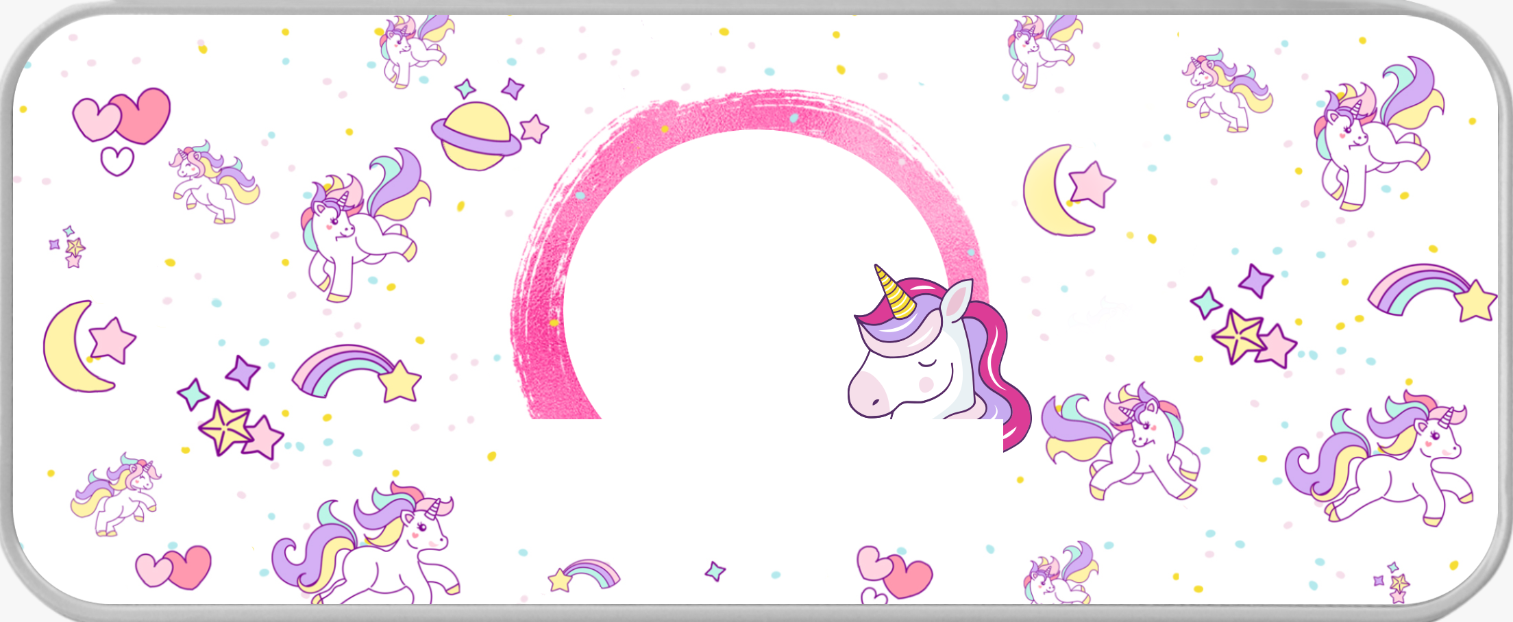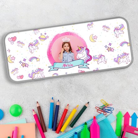 Potrivit pentru fetițele care iubesc unicornii, avem acest penar care poate fi personalizat cu o poză și nume. Copii sunt pasionați de desene și culori, ce spui să îi surprinzi cu un penar personalizat? Vor fi încântați să îl folosescă pentru depozitarea unor obiecte mici sau a instrumentelor de scris sau de colorat.