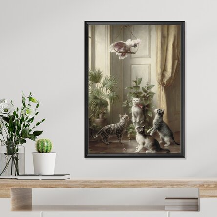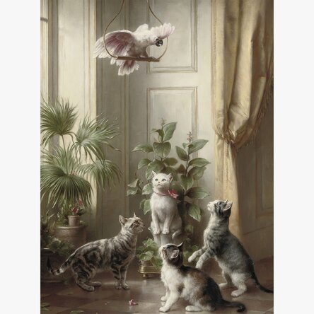 Printr-un realism minuțios și detalii delicate, Reichert redă expresiile jucăușe ale pisicilor și atitudinea cochetă a cacadului, creând o compoziție animată, plină de farmec și personalitate.