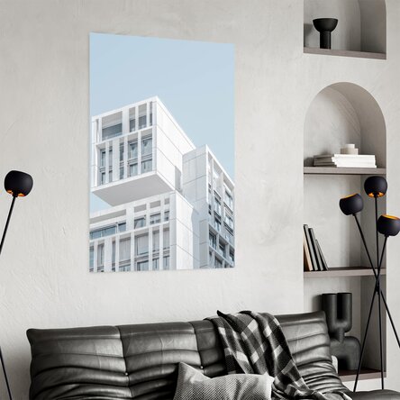 Fațada albă, compusă din panouri modulare și ferestre mari, reflectă lumina naturală într-un mod difuz, amplificând impresia de puritate și rafinament. Fundalul în nuanță pală de albastru sporește senzația de aerisire și liniște, plasând structura într-o atmosferă aproape conceptuală.