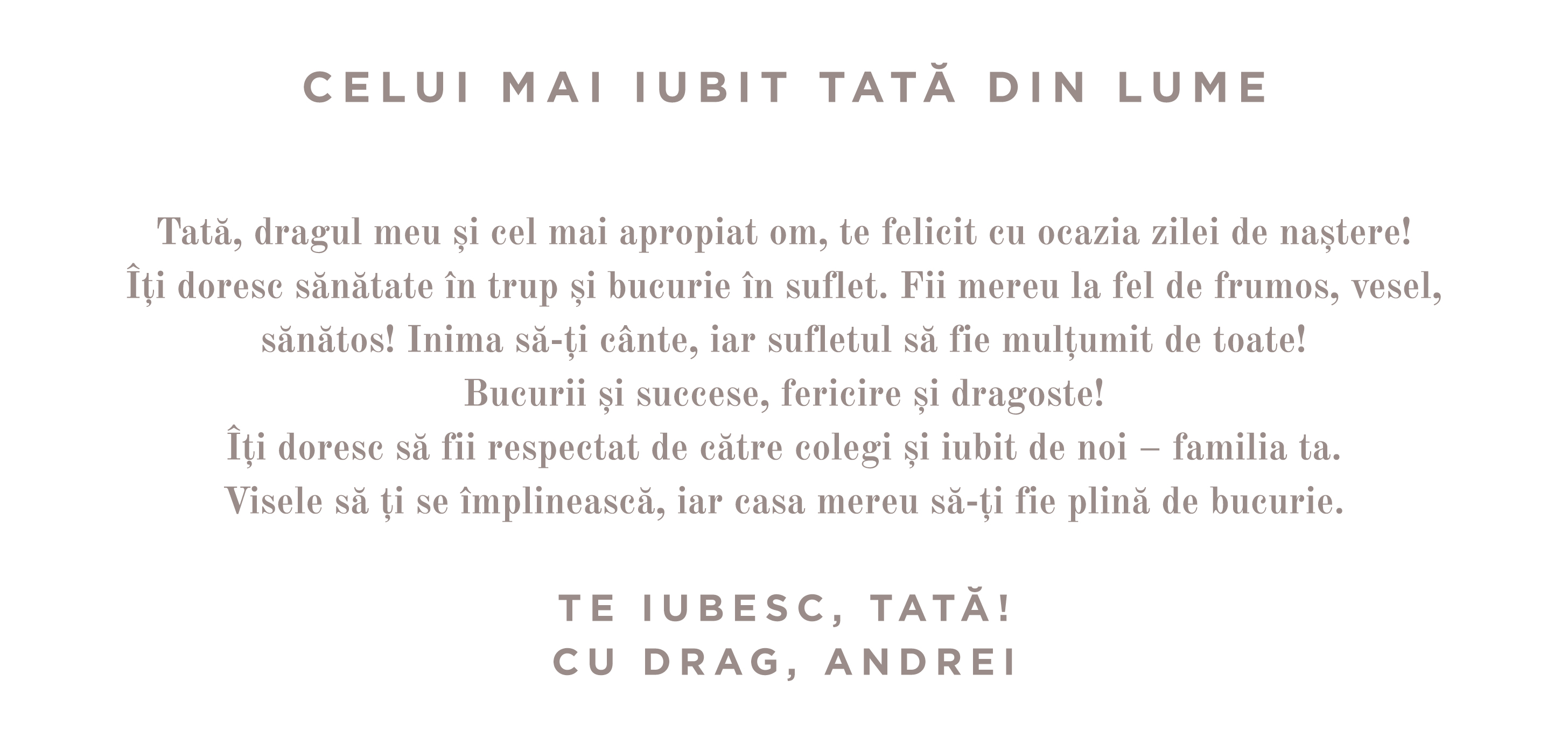 Pentru cei care în ochii noștri sunt niște eroi, cei care ne sunt alături la bine și la greu, cei pe care îi privim ca pe un model și încercăm să le urmăm calea, cei care ne-au dat viață și ne-au crescut așa cum au știut ei mai bine, suntem recunoscători. Pentru felul cum s-au dedicat pentru noi, merită să le oferim toată recunoștința și să le spunem ori de câte ori avem ocazia "tată" și cât de mult îi iubim și apreciem pentru ceea ce sunt.