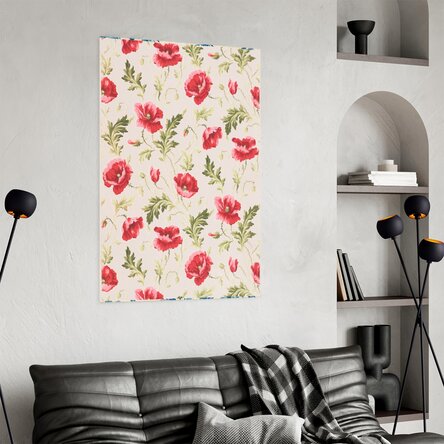 Un decor floral delicat, în care macii roșii și roz se deschid generos printre frunze dantelate, într-un dans liniștit și fluid.