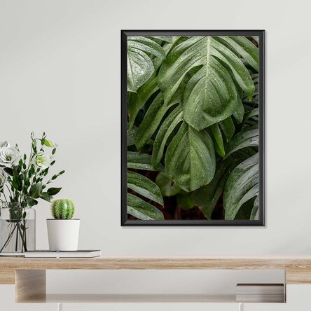Frunzele mari de monstera dau viață acestui poster cu un aer proaspăt și tropical. Un design care aduce verdele luxuriant al naturii direct în spațiul tău, perfect pentru interioare relaxate și moderne.