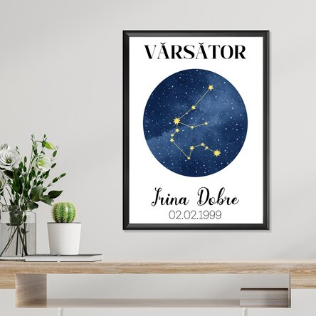 Surprinde magia zodiei Vărsător cu un poster personalizat plin de farmec. Fie că alegi să adaugi un nume, o dată specială sau un mesaj din inimă, acest tablou înstelat va spune o poveste unică – povestea ta. Ideal pentru Vărsătorii visători și originali, pentru aniversări, zile de naștere sau pur și simplu ca decor inspirat pentru camera celor născuți sub semnul Vărsătorului.