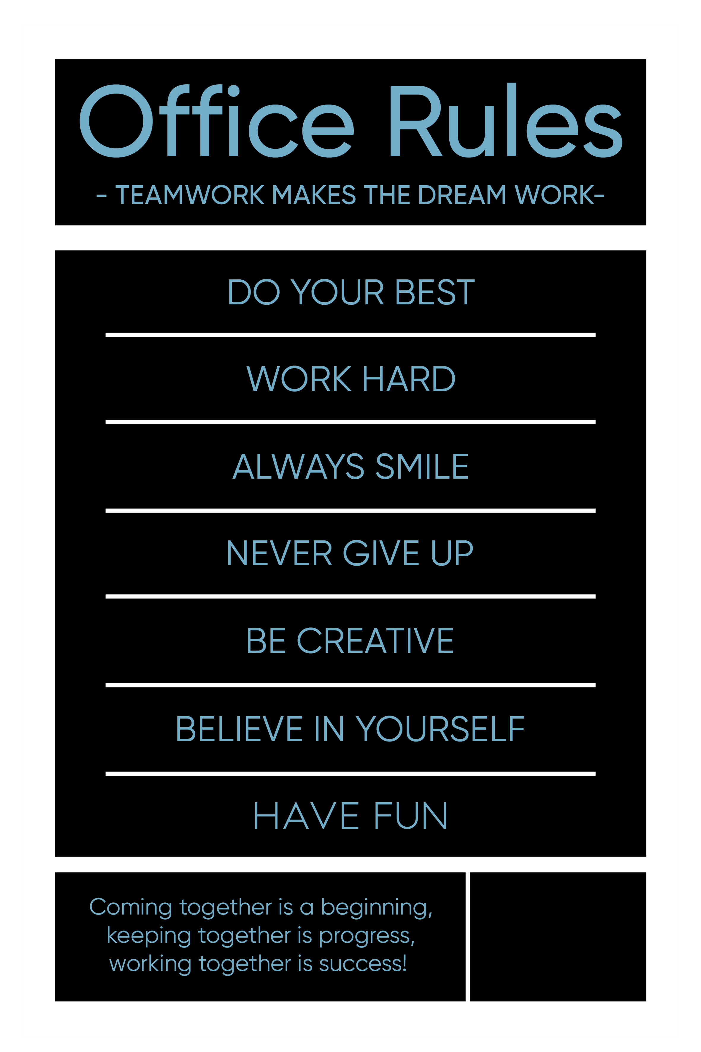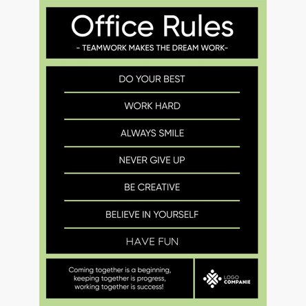 Un material vizual dedicat angajaților, conceput pentru a reaminti, într-un mod prietenos, regulile esențiale ale unui spațiu de lucru armonios. Ideal pentru zone comune, săli de ședință sau spații de relaxare, acest poster contribuie la menținerea unui mediu profesionist, plăcut și eficient pentru toți colegii.