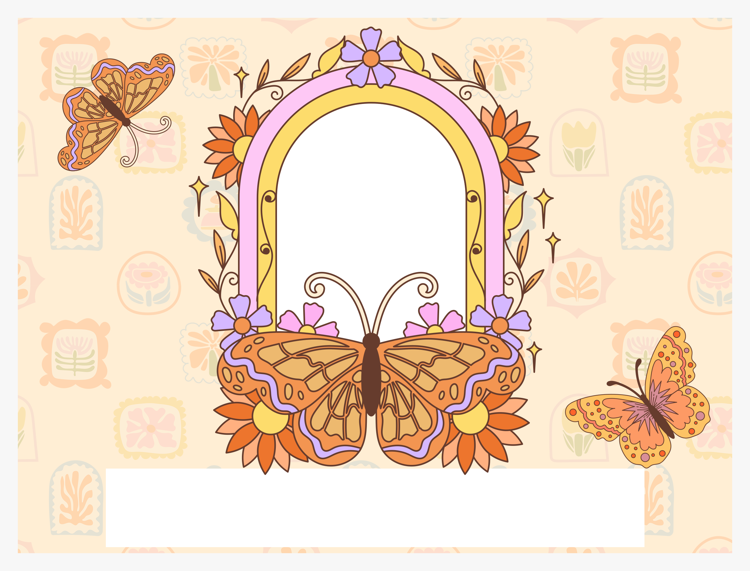 Ilustrația jucăușă cu fluturi și flori în stil retro-boho încadrează o fotografie dragă, iar mesajul cald – „În fiecare copil se află o rază de lumină gata să aprindă lumea” – aduce un strop de inspirație în fiecare piesă.