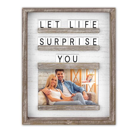 Rama vine cu un set de 120 de cartonașe din lemn cu litere pentru a putea personaliza mesajul dorit.