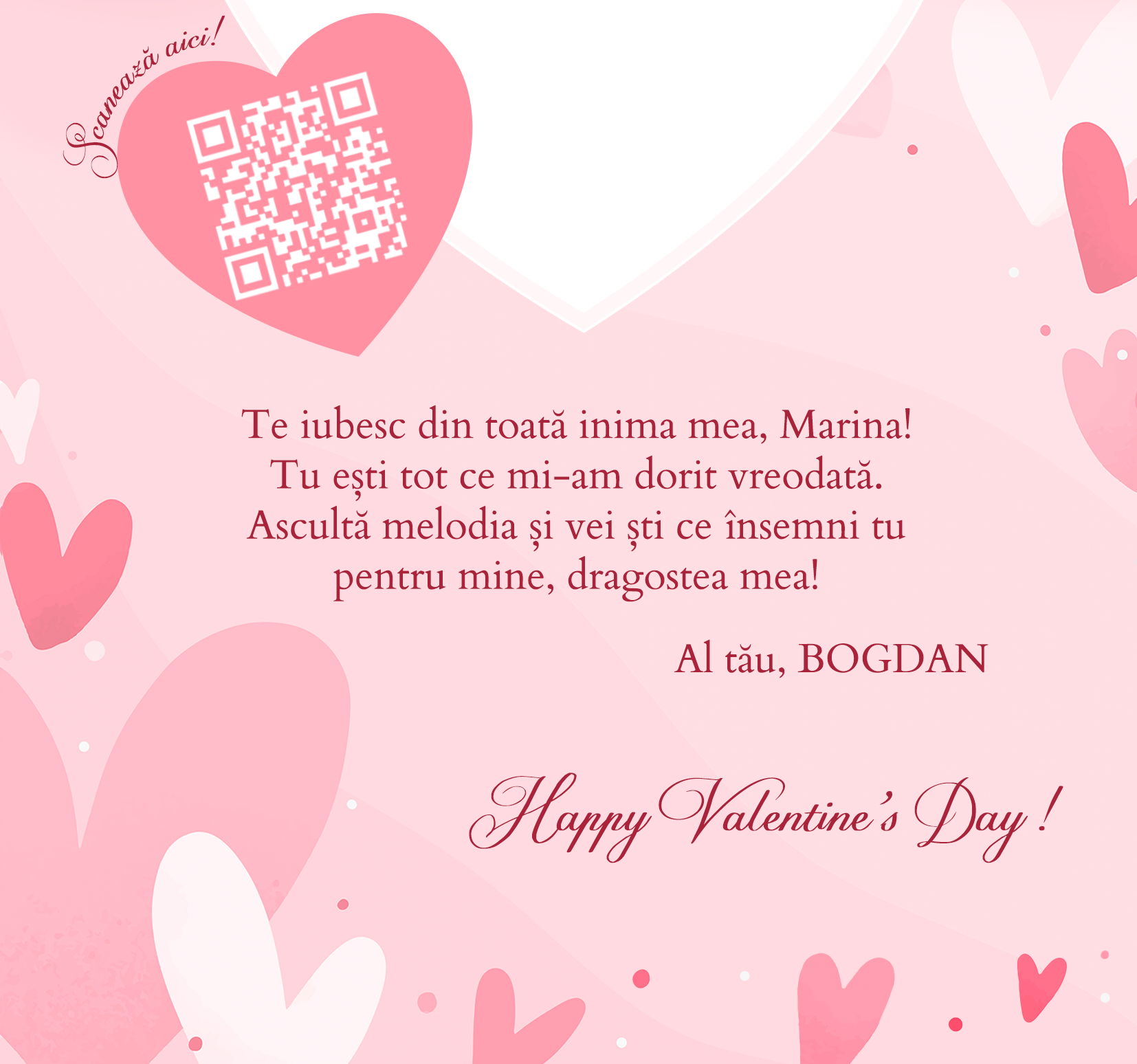 Ai posibilitatea să scrii link-ul cu melodia voastră preferată și să îi transmiți ceea ce simți. Persoana iubită va putea asculta melodia oricând doar scanând codul QR.