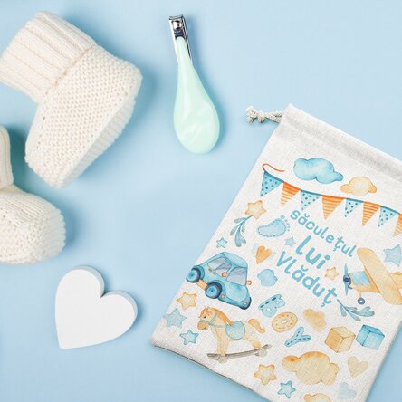 Săculețul personalizat completează perfect cadoul pentru băiețelul tău. Transmite-i un mesaj draguț și fă-i ziua mai frumoasă.