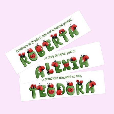 Semn de carte personalizat cu mesaj și nume - Buburuze