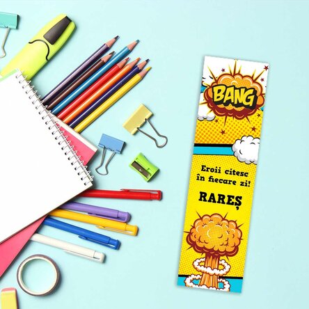 Un semn de carte vesel și colorat, inspirat din lumea benzilor desenate! Cu elemente grafice haioase, buline de text, expresii tipice din comics și un stil plin de energie, acest semn de carte transformă orice lectură într-o aventură vizuală. Perfect pentru copiii care iubesc distracția și poveștile pline de imaginație!