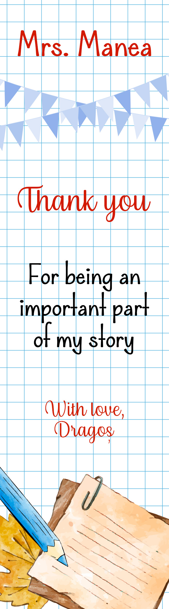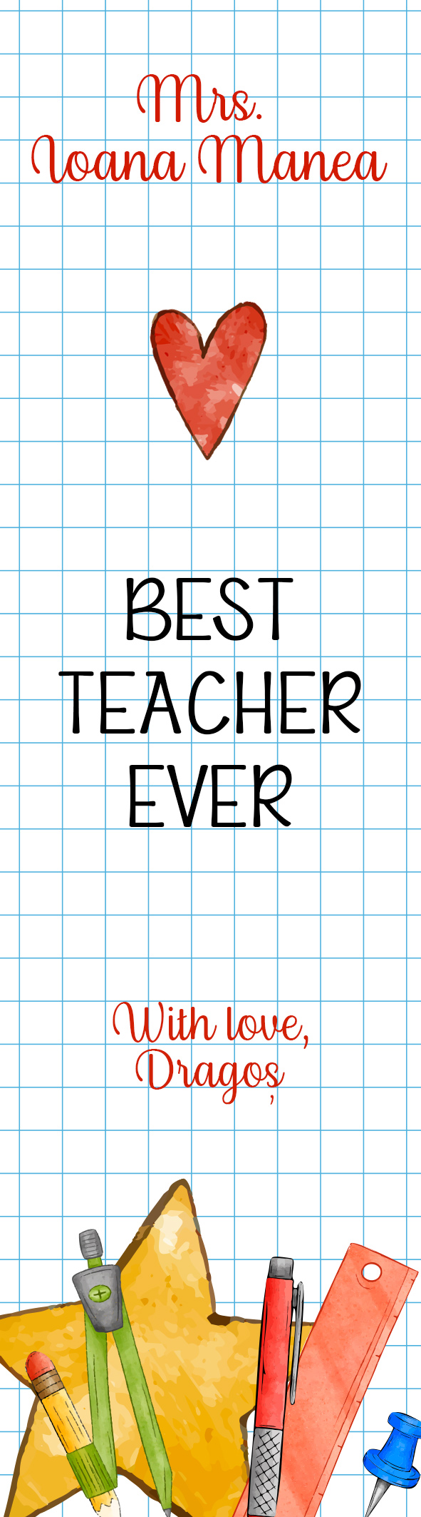 Alege să-ți arăți aprecierea cu un cadou atent creat, cu un design aparte și un mesaj special pentru un profesor mult iubit. Cartea este considerată cel mai bun îndrumător, indiferent de vârstă iar un semn de carte oferit cu drag va fi păstrat ca o amintire valoroasă, la fel ca toate învățăturile și momentele dragi care au fost împărțite de-a lungul a celor mai frumoși ani de educație.
