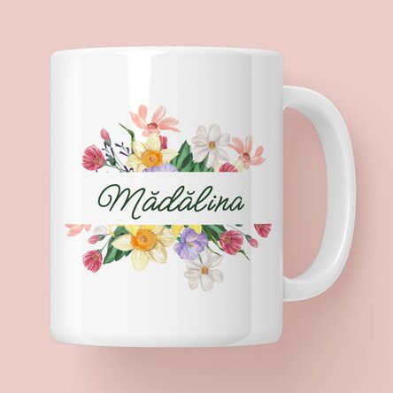 🌸 Cana personalizată cu nume, decorată cu un model floral de primăvară este ideală pentru cafea, ceai sau momentele de relaxare.