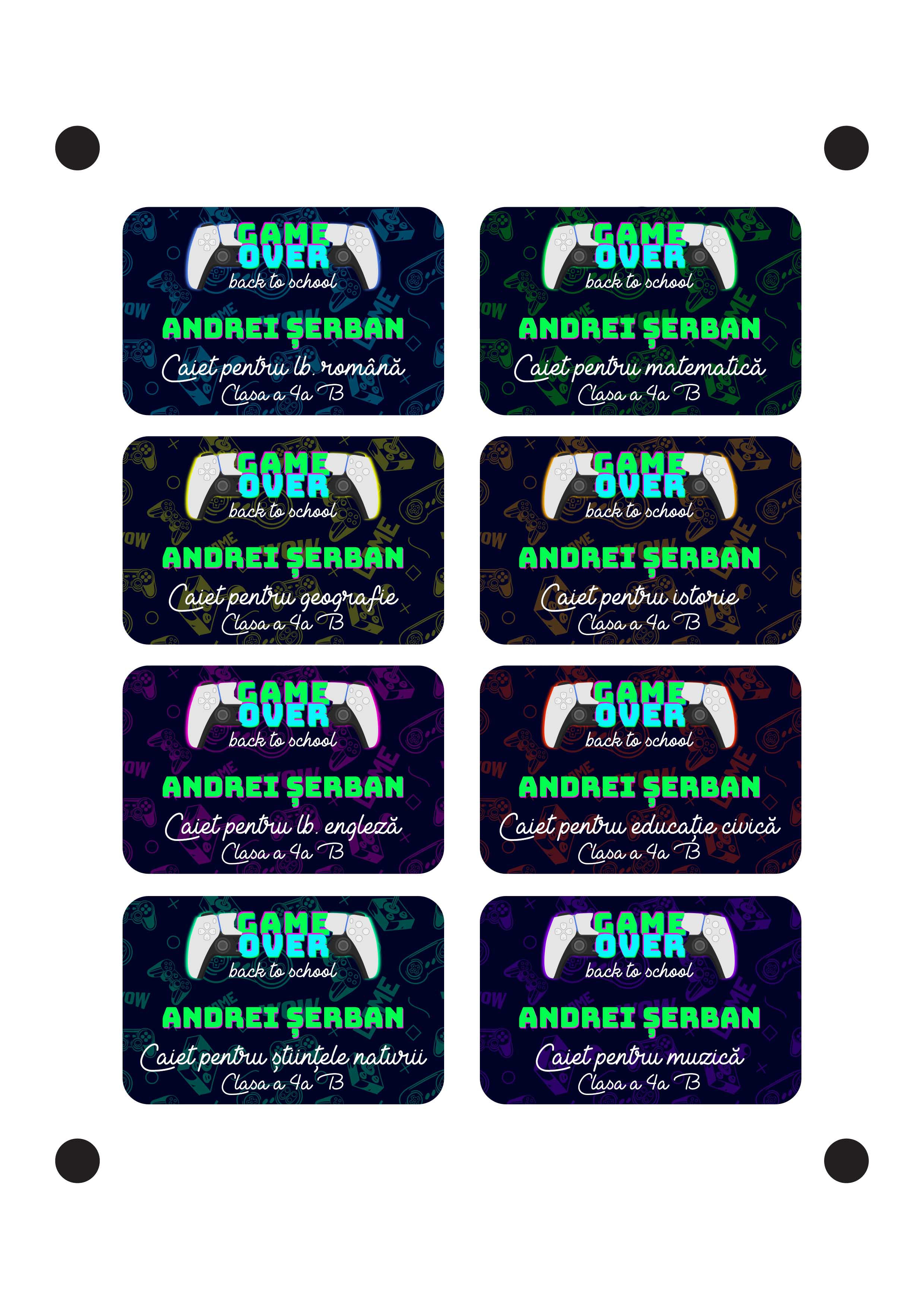 Set de 8 stickere (etichetă autoadezivă) personalizate pentru școală cu text - Game Over