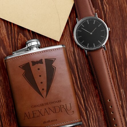 Sticlă de buzunar îmbrăcată în piele personalizată cu text - Pentru cavaleri de onoare