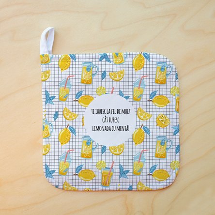 Suportul personalizat pentru oala este un cadou simplu si util ce poate fi accesorizat foarte usor cu o manusa personalizata, tot de la noi! Scriei un mesaj reprezentativ sau spune-i cat de mult o iubesti si cu siguranta o sa fie impresionata daca vei face o referire la cat de bine se descurca in bucatarie! Iar designul colorat se potriveste perfect daca sunteti fani de limonada!